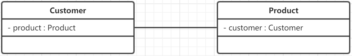 从上图中我们很容易看出,所谓的双向关联就是双方各自持有对方类型的成员变量。在UML类图中,双向关联用一个不带箭头的直线表示。上图中在Customer类中维护一个Product[]数组,表示一个顾客购买了那些产品;在Product类中维护一个Customer类型的成员变量表示这个产品被哪个顾客所购买。