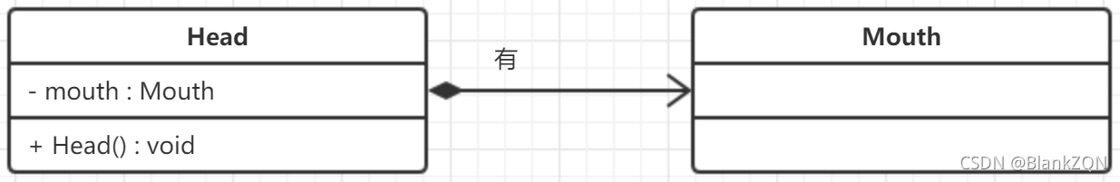 显然,嘴是头的一部分且不能脱离了头而单独存在。在UML类图中,组合关系用一个带实心菱形和箭头的直线表示。