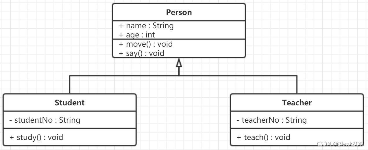 继承关系对应的是extend关键字,在UML类图中用带空心三角形的直线表示,如下图所示中,Student类与Teacher类继承了Person类。