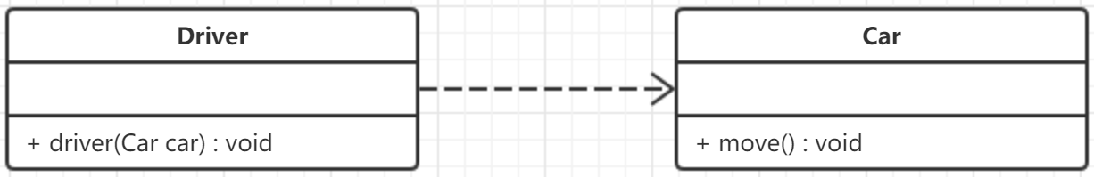 从上图我们可以看到,Driver的drive方法只有传入了一个Car对象才能发挥作用,因此我们说Driver类依赖于Car类。在UML类图中,依赖关系用一条带有箭头的虚线表示。
