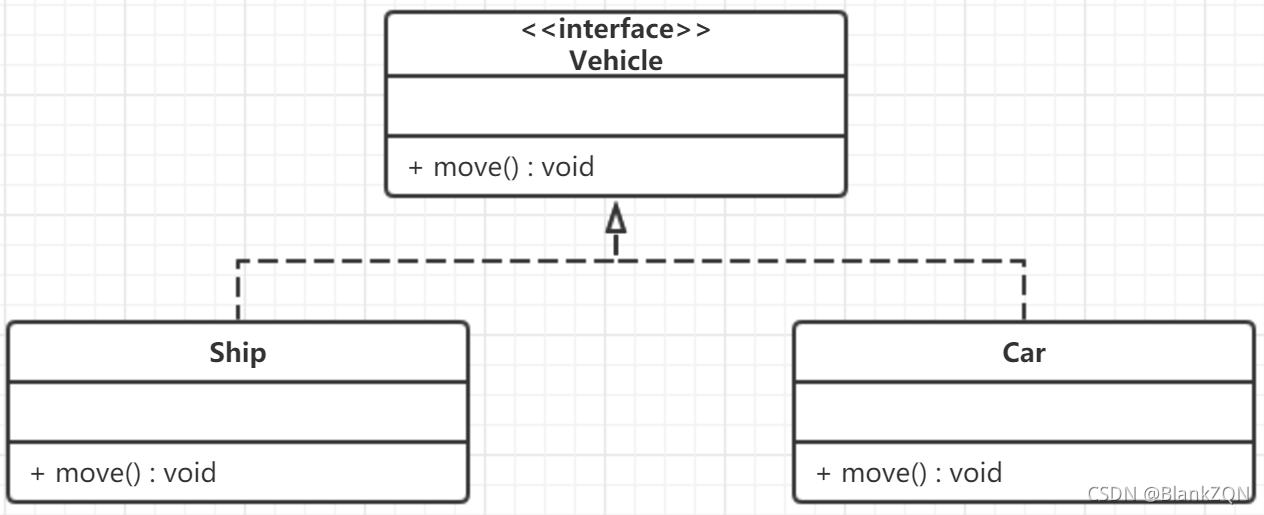 这种关系对应implement关键字,在UML类图中用带空心三角形的虚线表示。如下图中,Car类与Ship类都实现了Vehicle接口。