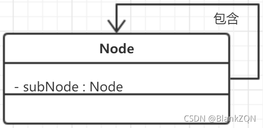 自关联在UML类图中用一个带有箭头且指向自身的直线表示。上图的意思就是Node类包含类型为Node的成员变量,也就是“自己包含自己”。