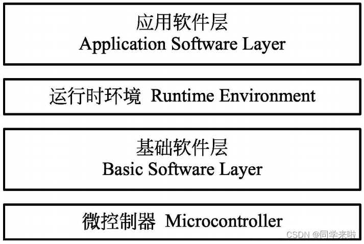 在AUTOSAR软件架构中,汽车嵌入式系统软件自上而下分别为:应用软件层(Application Software Layer,ASW)、运行时环境(Runtime Environment,RTE)、基础软件层(Basic Software Layer,BSW)和微控制器(Microcontroller)。