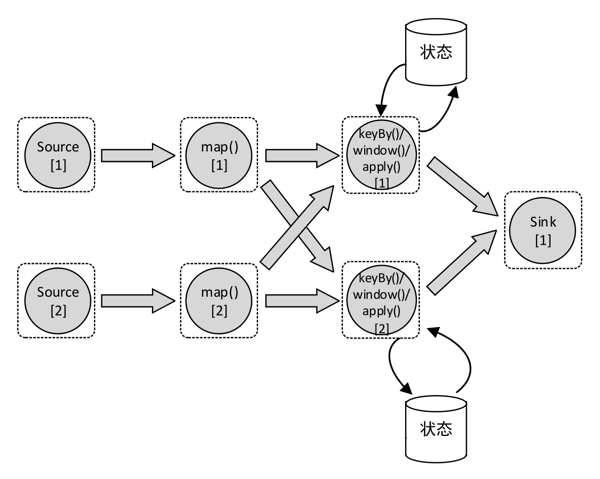 如下图,Source、map()、keyBy()/window()/apply()算子的并行度为2,Sink算子的并行度为1。keyBy()/window()/apply()算子是有状态的,并且map()与keyBy()/window()/apply()算子之间通过网络进行数据分发。