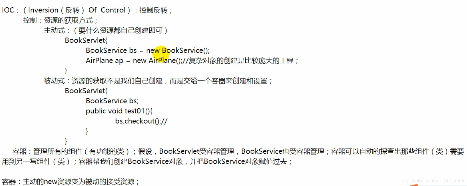 - ioc 就是把创建对象的控制权交给Spring来管理,我们只要向容器提出需求,容器就会按需求提供相应的对象。