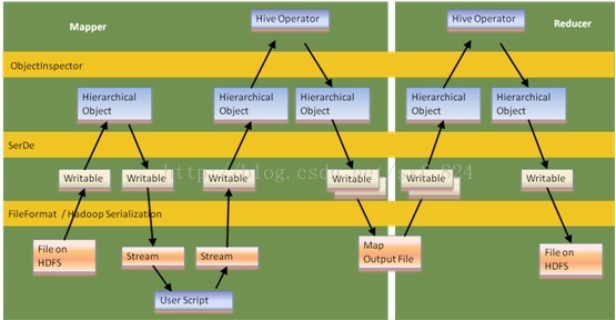Hive 中operator处理的数据都是Object加上一个ObjectInspector对象,我们可以非常方便的通过该ObjectInspector对象了解到上游传过来的值是什么,如果是Struct对象,可以进一步了解到有多少了Filed,进而获取每个Filed的值,而且通过Serde可以方便的完成数据的序列化操作。