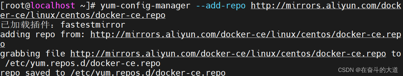 [root@localhost ~]# yum-config-manager --add-repo http://mirrors.aliyun.com/docker-ce/linux/centos/docker-ce.repo