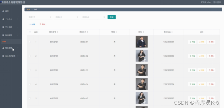 教师管理:在教师管理页面,可以对索引、教师工号、教师姓名、性别、照片、教师电话等内容进行详情、修改和删除等操作,如图5-4所示: