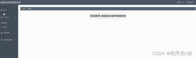 教师功能:教师登录到班级综合测评管理系统后,可以对首页、个人中心、学生管理、综合测评管理等进行操作,如图5-10所示: