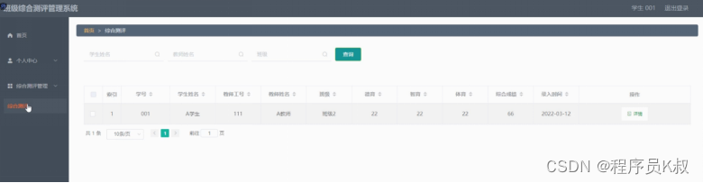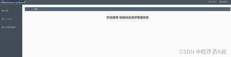学生功能:学生登录到班级综合测评管理系统后,可以对首页、个人中心、综合测评管理等进行操作,如图5-7所示: