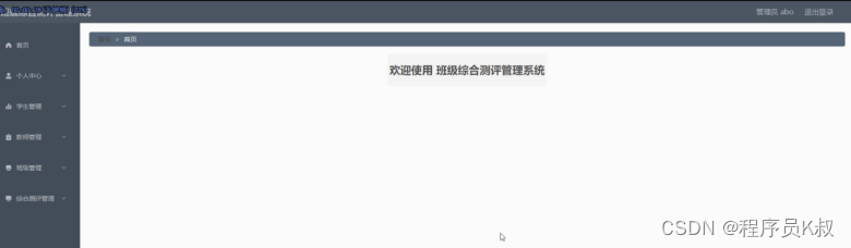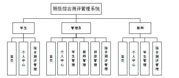 管理员功能:管理员登录系统后,能对首页、个人中心、学生管理、教师管理、班级管理、综合测评管理进行操作。管理员功能如下图所示:
