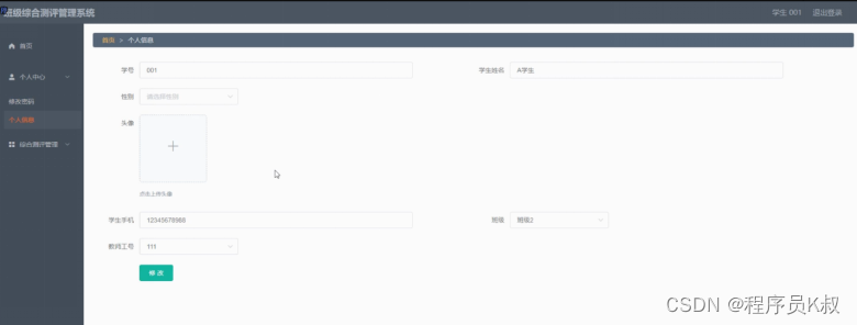 个人中心:学生可以将学号、学生姓名、性别、头像、学生手机、班级、教师工号等个人信息进行修改,还能修改密码,如图5-8所示: