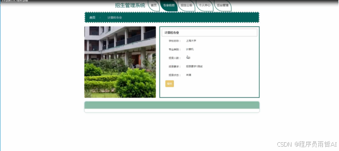 招生管理系统,在系统首页可以查看首页、专业信息、招生公告、个人中心、后台管理等内容进行详细操作,如图5-1所示。