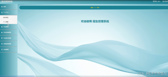 管理员登录系统后,可以对首页、个人中心、学生管理、专业信息管理、专业报名管理、录取通知管理、系统管理等功能模块进行相应操作,如图5-6所示。