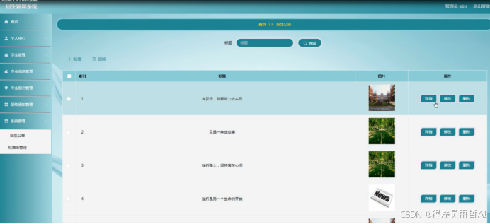 系统管理,在招生公告页面中可以对索引、标题、图片等内容进行详情、修改或删除等操作,也可以对轮播图管理进行相应的操作,如图5-11所示。