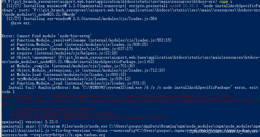 首先安装缺失的模块node-bin-setup,执行命令cnpm install node-bin-setup(此处使用的是淘宝镜像cnpm,如果没有淘宝镜像,可用npm安装node-bin-setup)