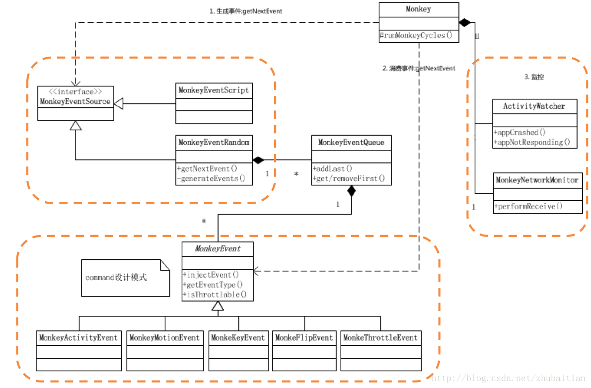 - getNextEvent方法通过调用对应的的MonkeyCommand接口实现类的translateCommand方法把字串命令翻译成对应的monkey事件然后保存到commandQueque维护的quequeEvents队列