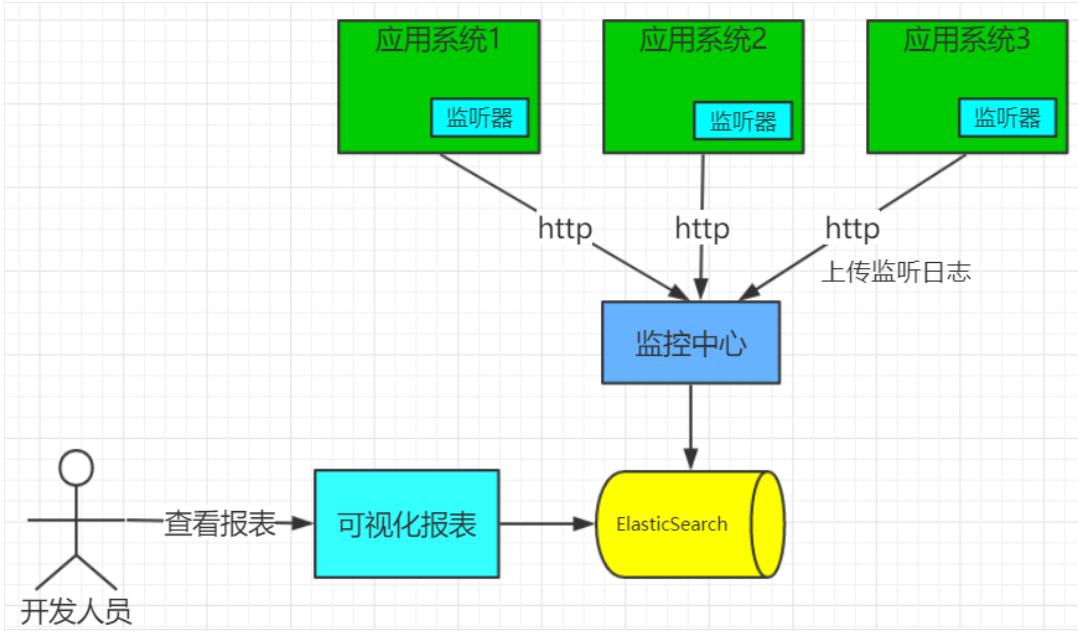 - 监听器开始收集应用系统的监听数据通过http-json的方式发送给监控中心,监控中心把这些数据上传到ElasticSearch中。