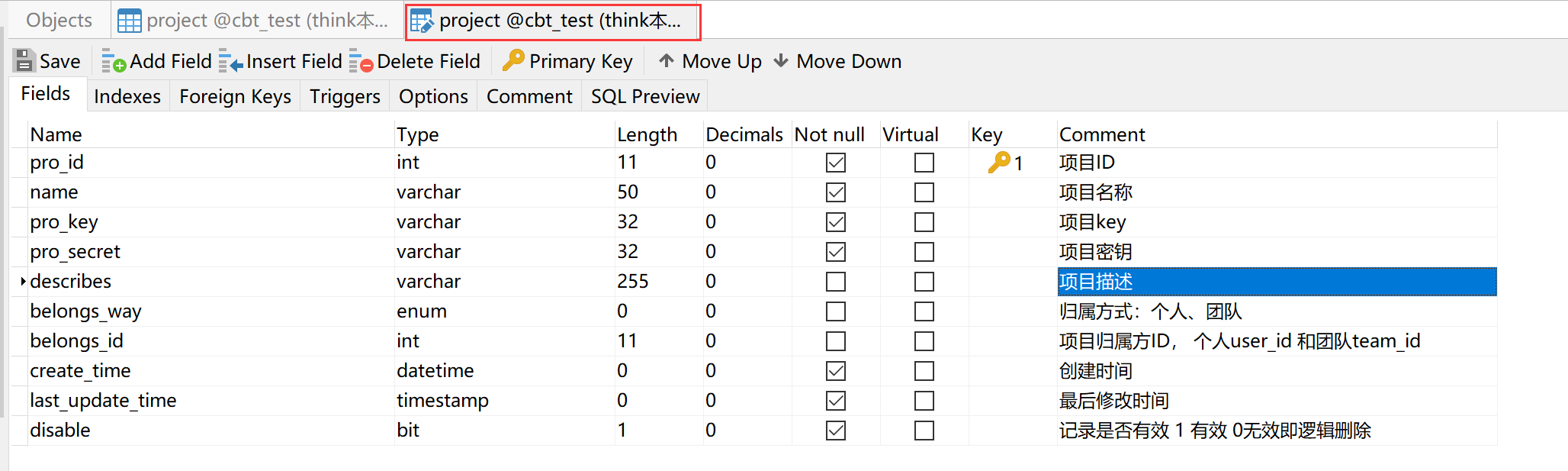 project 表,主要是为了接入的时候使用的。跟agent的conf中保持一致