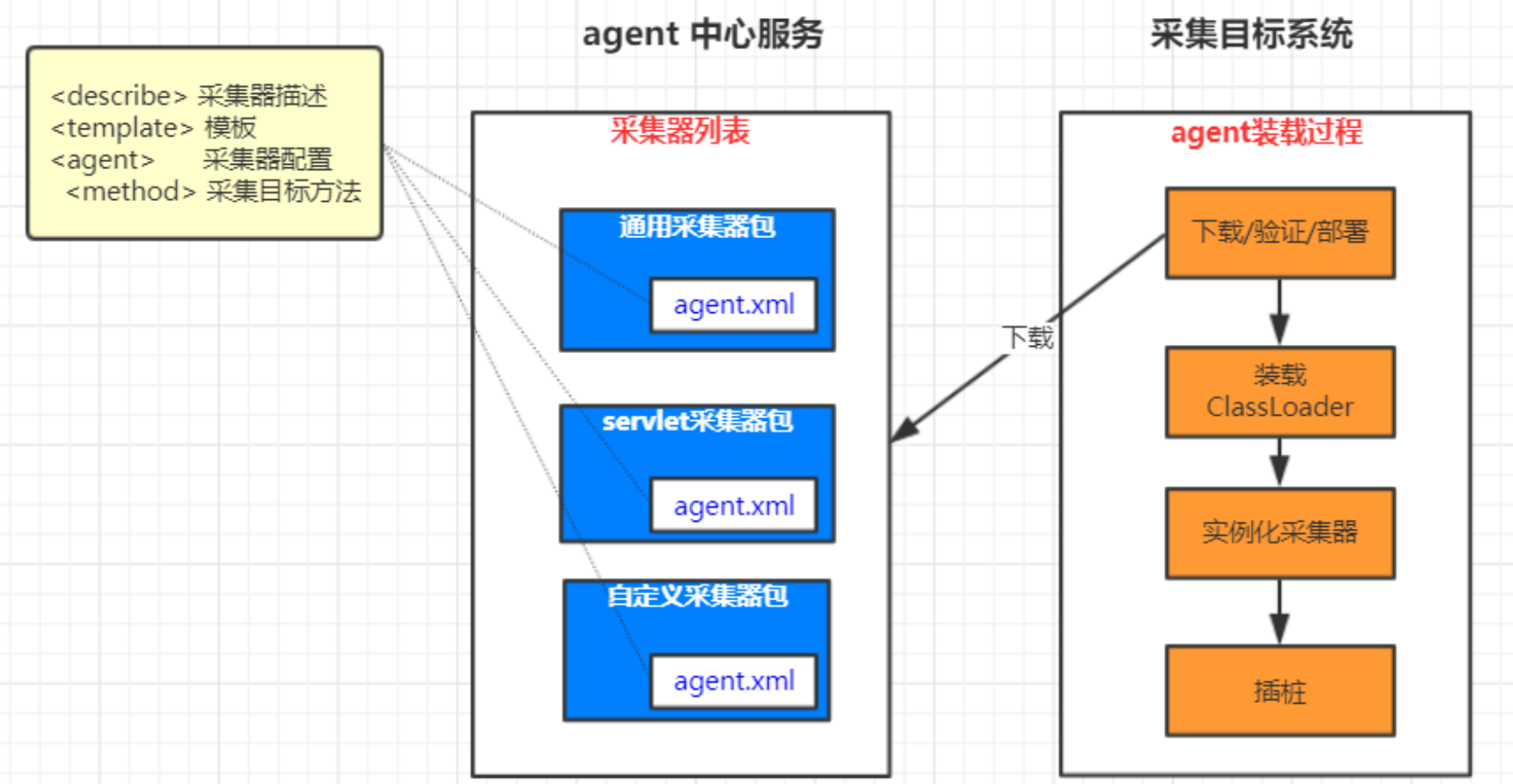 - 下载的时候先解析里面的agent.xml进行,才会认为他是真正的采集器包。