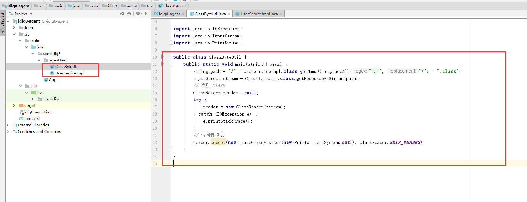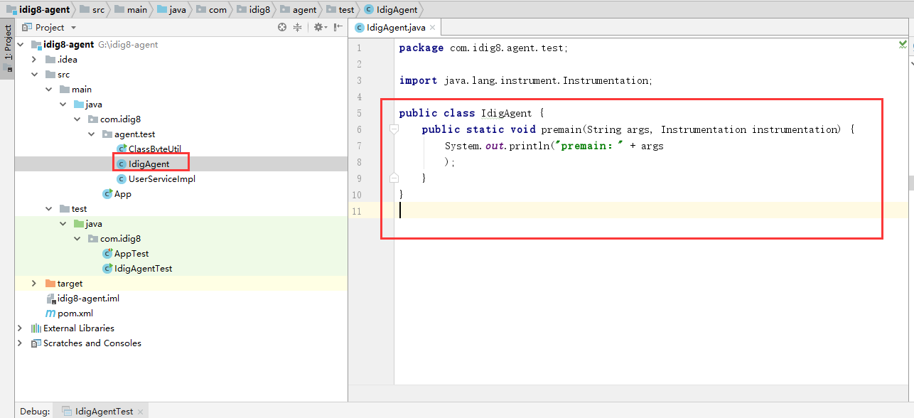 在main中新建立一个类IdigAgent