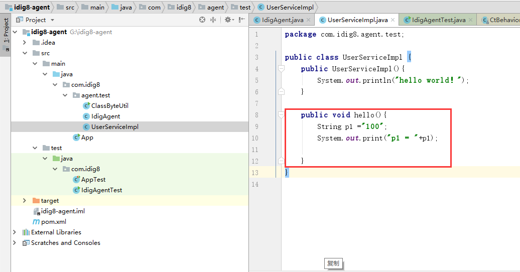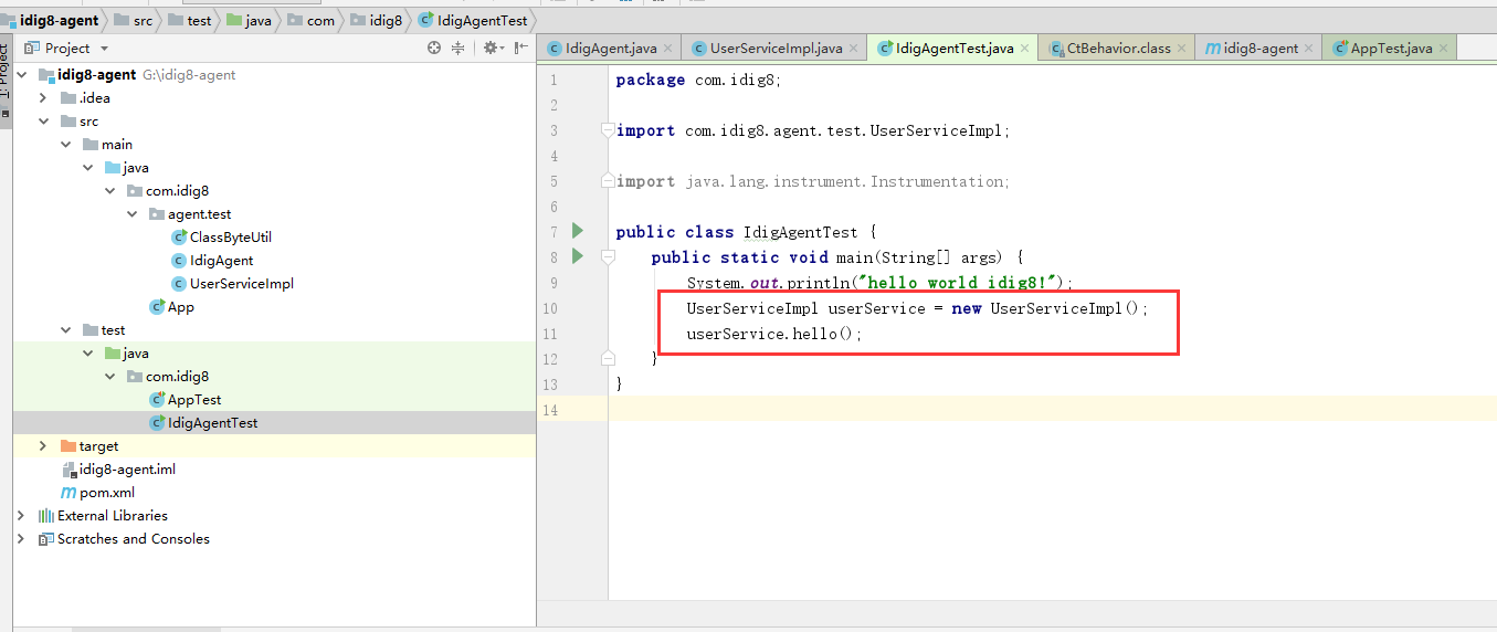 IdigAgent ->IdigAgentTest->UserServiceImpl的类->UserServiceImpl被插桩启动开始的hello-> 打印hello方法体