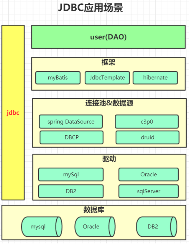 这些user,框架,连接池,驱动都依赖jdbc,jdbc是一个什么东西?jdbc是一种规范,一堆接口组成的规范j2se,由驱动来实现的。servlet也是一种接口规范,是j2ee的规范,由tomcat,jetty等容器实现的。任任何一层都可以做为插桩的切入点,但是选用User 层、框架层、连接池&数据源层、驱动层其实现是多样的,无法做到普适性。所以在此选用JDBC 作为插桩切入 点。