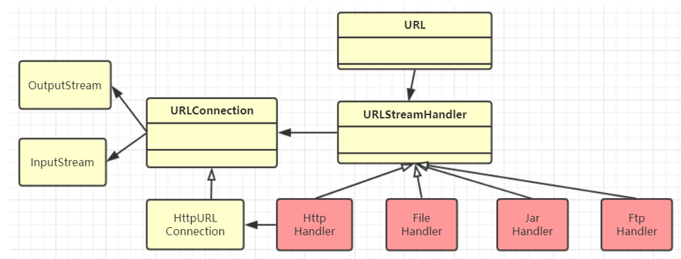 URL==》URLStreamHandler==》URLConnection==》outPutStream、InputStream。