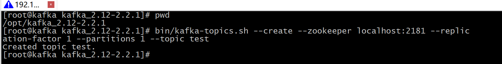 bin/kafka-topics.sh --create --zookeeper localhost:2181 --replication-factor 1 --partitions 1 --topic test