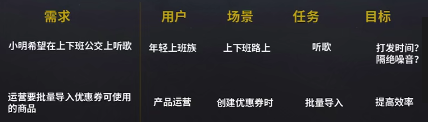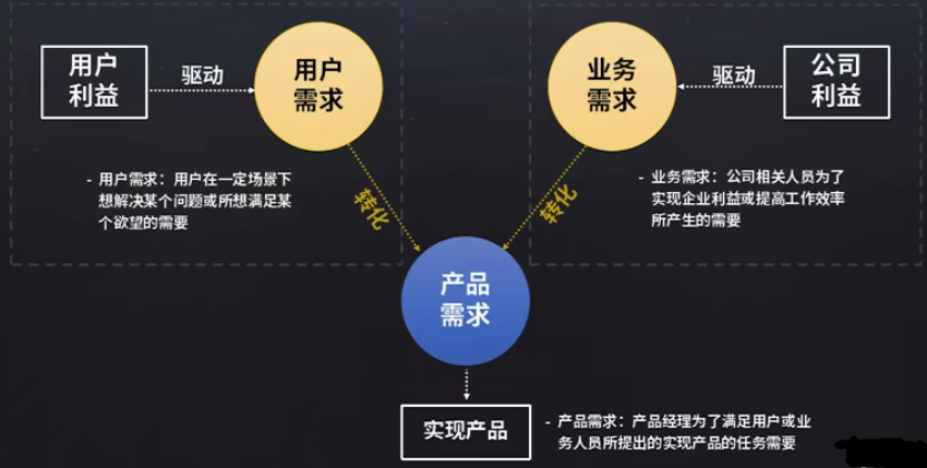 - ① 从用户需求、业务需求出发,挖掘其真实目标,并转化为产品需求的过程。