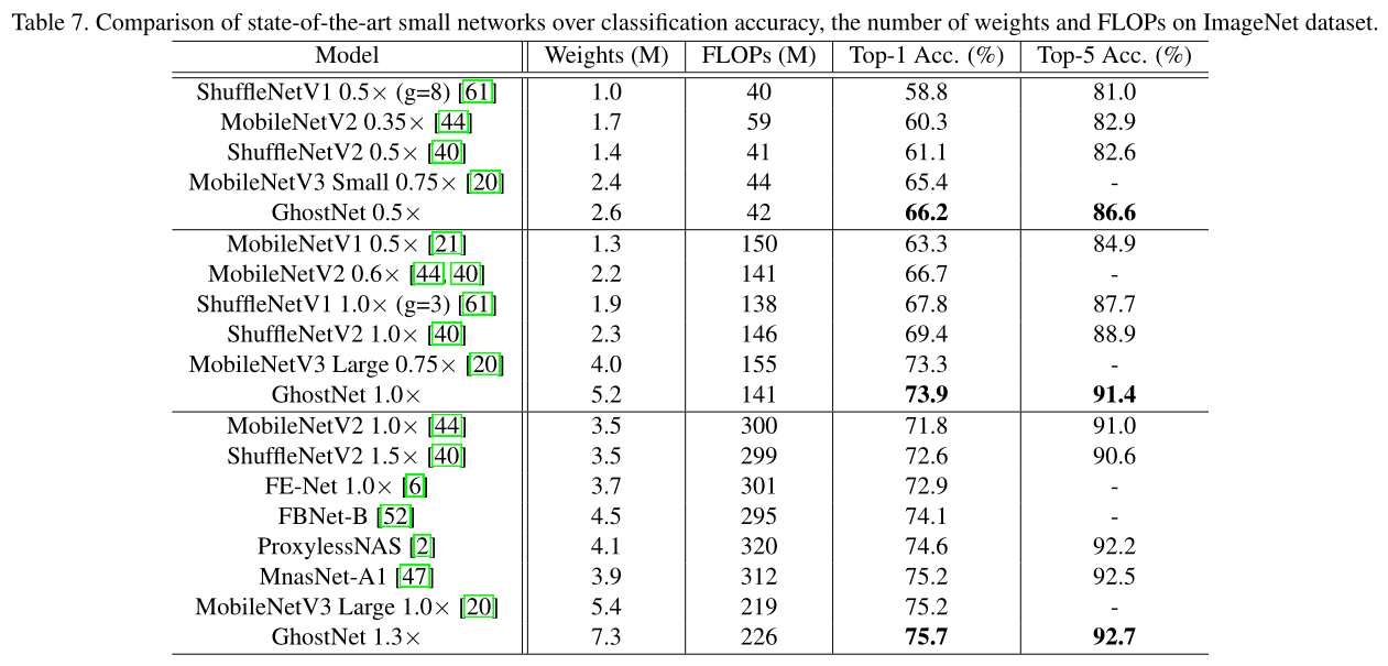 表6是GhostNet在ImageNet上测试得到的结果,同样是实现了2x的加速,并且准确率上基本没有损失。