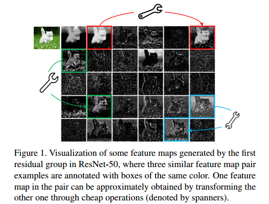 常规的CNN网络提取到的特征图有很多冗余信息,如下图,扳手连接的两个位置的特征图类似。