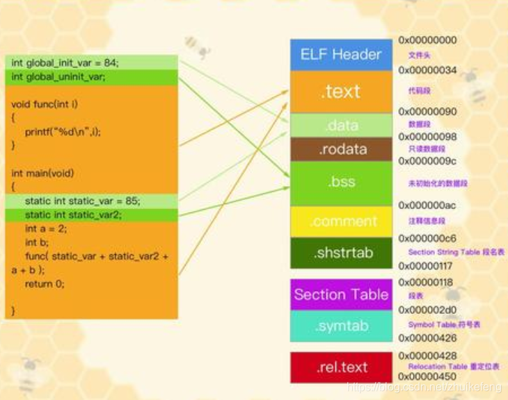 ELF文件开始是一个文件头,它描述了整个文件的文件属性,包括文件是否可执行、是静态链接还是动态链接、目标硬件、目标操作系统等信息。文件头还包括一个段表,段表描述了文件中各个段在文件中的长度,偏移位置及段的属性等,可以通过命令readelf -h 文件名查看。一般C语言编译后执行语句的机器代码保存在.text段,已初始化的全局变量和局部静态变量保存在.data段,未初始化的全局变量保存在.bss段,.bss段只是为未初始化的全局变量和局部静态变量预留位置而已,它并没有内容,所以它在文件中也不占空间。可以使用objdump -h 文件名将ELF文件的各个段的基本信息打印出来,Size表示段的大小,File off表示段所在的位置。使用命令objdump -s -d 文件名,表示将所有段的内容以二进制的方式打印,-d表示将包含指令的段反汇编。