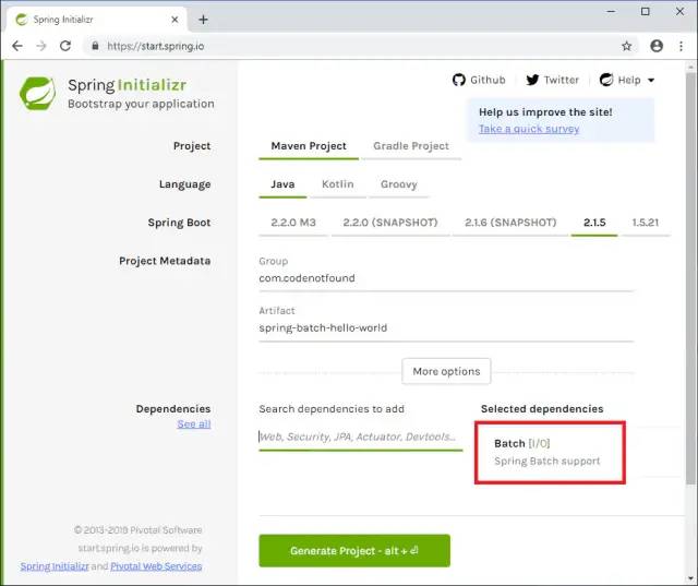 让我们使用Spring Initializr来生成Maven项目。确保选择Batch作为依赖项。
