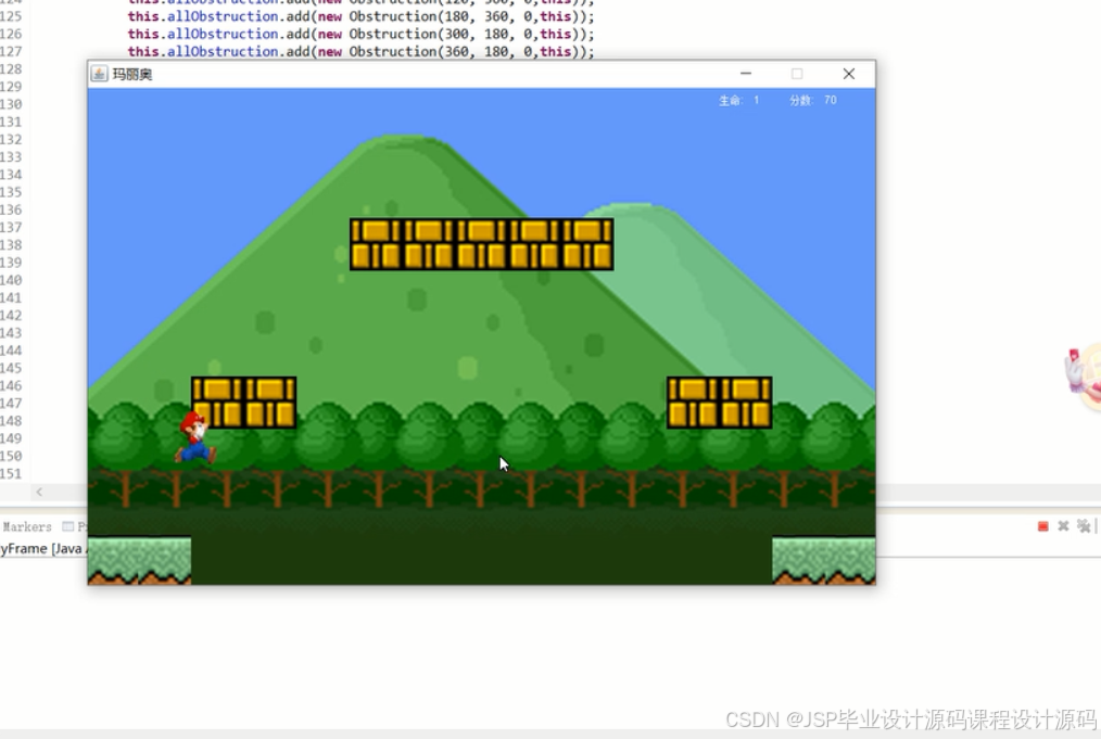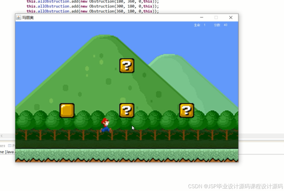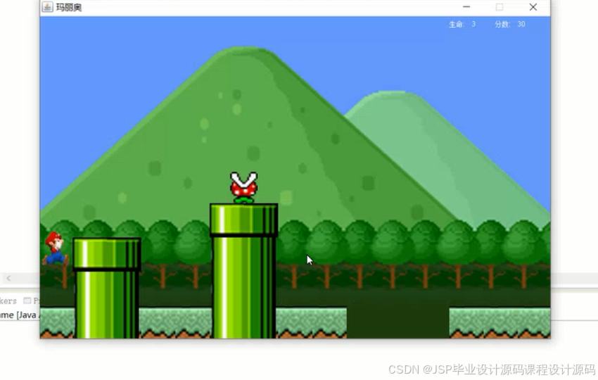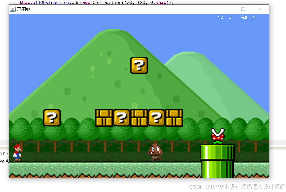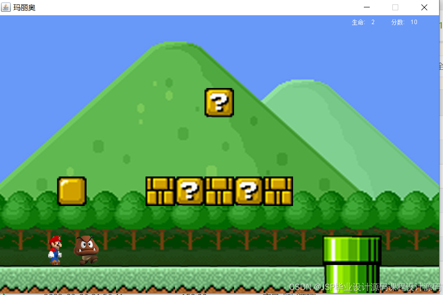 - 马里奥顶到金币会增加分数,当马里奥失去3条生命时游戏结束。