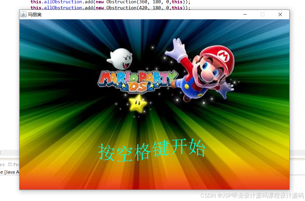 将该类的名字定义为MyFrame,并且要在该类中实现KeyListener接口和Runnable接口。然后首先要在该类中定义一个List集合,集合的泛型为背景类BackGround,集合的名字定义为allBG,用于存放所有的背景。接着定义一个Mario类属性,名字为mario,这个就是游戏运行时候的所需要的mario。接下来还要在类中定义一个BackGround属性,nowBG,默认值应当为空,会在构造方法中赋予该属性初值,这个属性主要是用来存放当前游戏运行时马里奥所处的游戏场景。另外该类中还应该有一个Thread类属性t,这个属性主要是为了在游戏运行的时候控制游戏的线程。然后就可以在类中定义main()方法,将该类实现就可以了。值得一提的是该类的构造方法相对来说是比较复杂的。