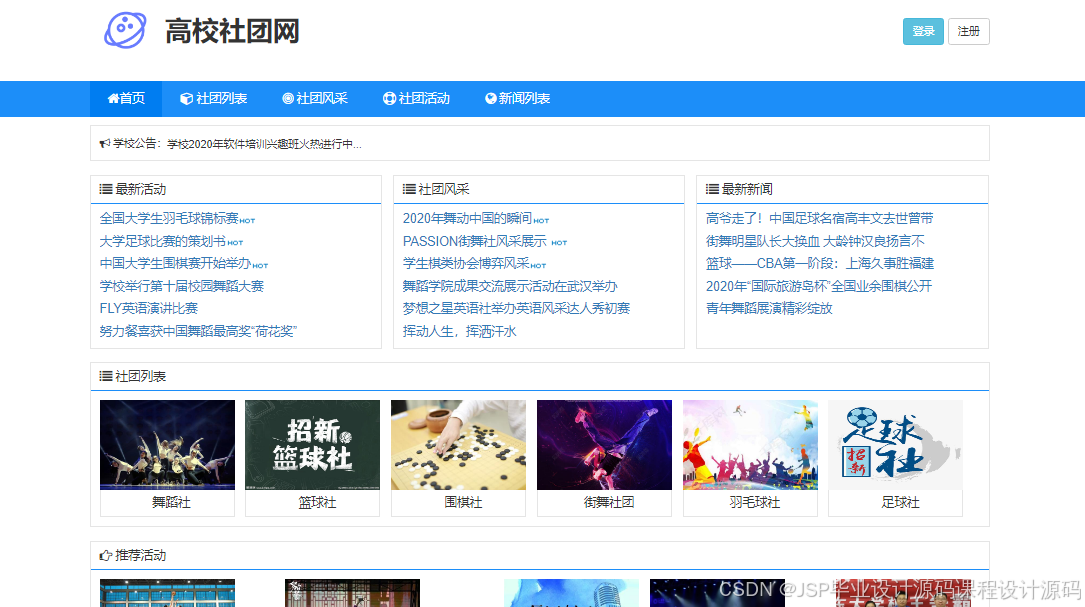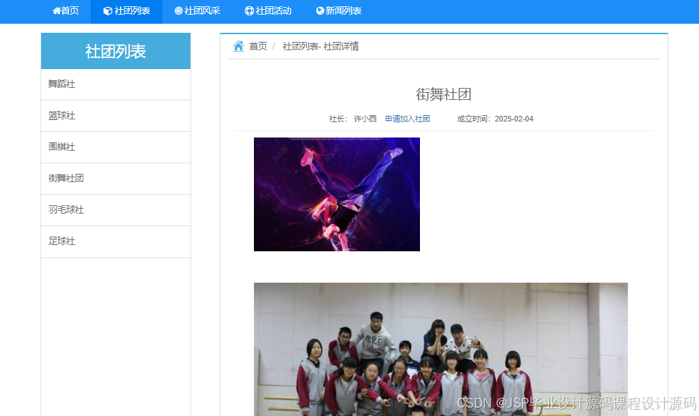 (7)社团介绍模快:这个模快中将学校所有的社团都简单的介绍了一下,