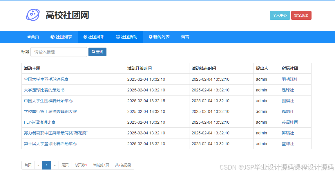 学生社团管理系统主要是为了给领导、各社社长、社员提供一个平台,在这个平台里社员可以在里进行活动策划、交流、发表对各社意见看法,社长可以管理本社团的社员,而学校领导则可以对整个学校的社员,活动情况进行有效管理。本系统主要完成了对用户权限、社员留言、社团新闻发表、社团活动申请、社员信息查询与修改、社团介绍等功能。系统开发主要包括JSP页面设计,servlet类编写与数据库表设计。本系统采用了JSP+Servlet+Mysql工具结构,因为学校社团数据量不是很大,故选用了简单方便的Mysql数据库。