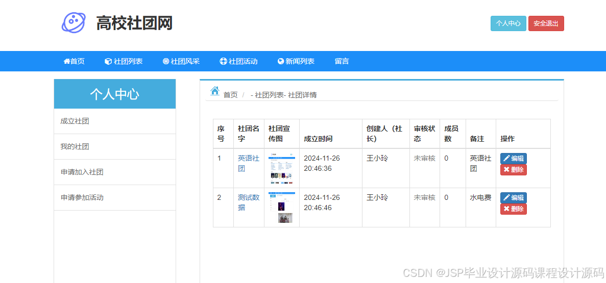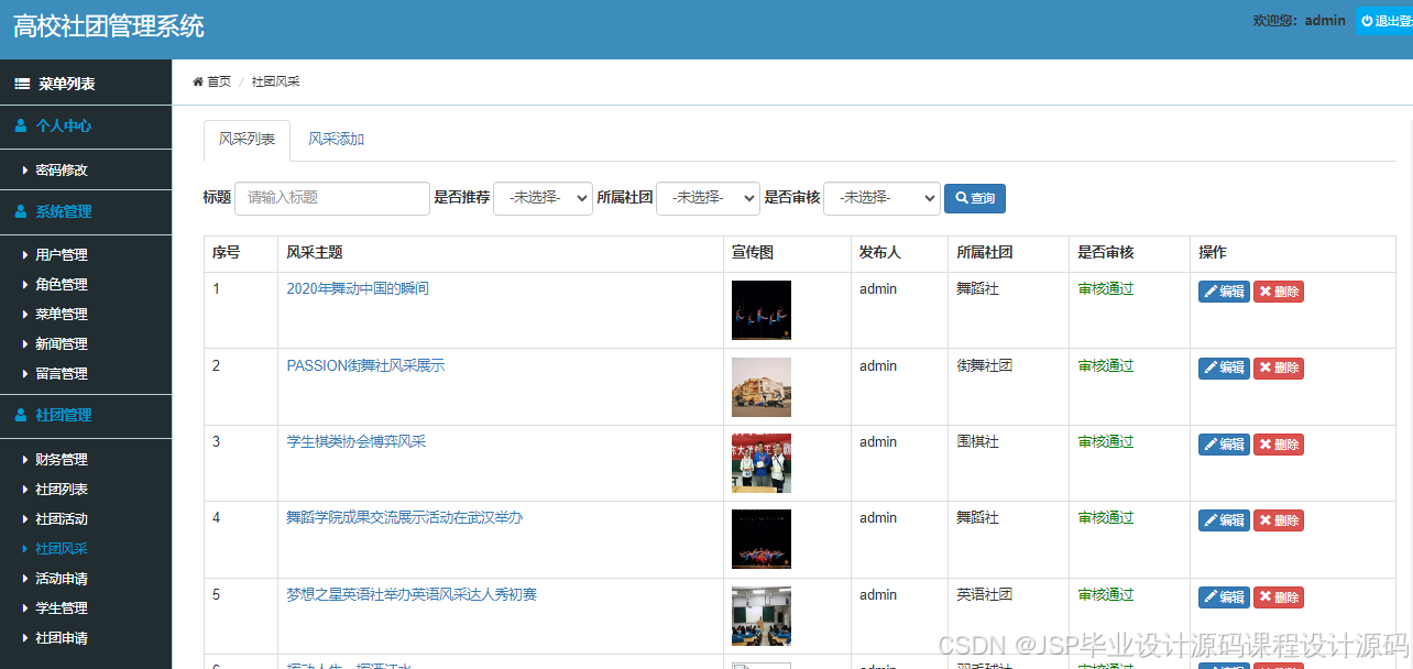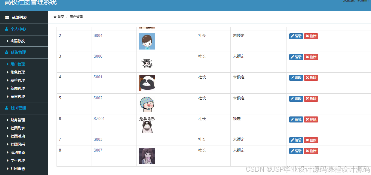 (9)会员管理模快:这个功能只对社长与学校管理员开放,社长有对本社社员进行增、删、查、改等管理,而学校管理员可以对学校所有社员进行管理,其中包括社长的任命。