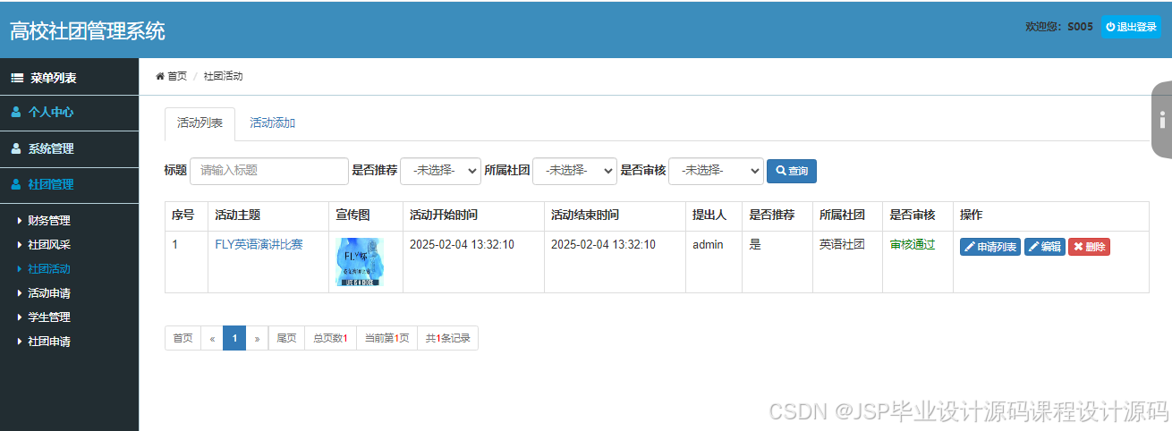 (5)活动申请功能。社长或普通社员要举办活需要在网上申请。得到学校领导同意方可举办。