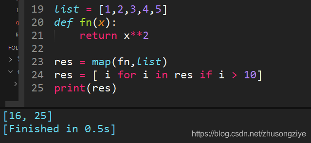 13、列表[1,2,3,4,5],请使用map()函数输出[1,4,9,16,25],并使用列表推导式提取出大于10的数,最终输出[16,25]