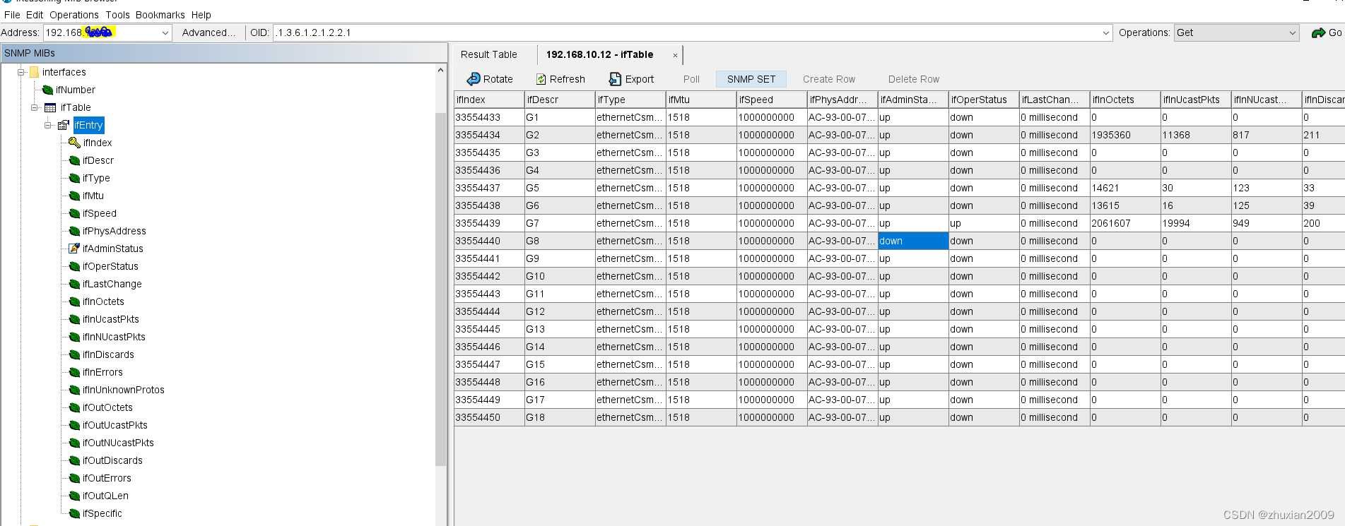 snmp关闭指定网口 1. 选择interfaces->ifTable->ifEntry,右键Table View,如上图所示。2.选择一个你想要设置的网口,点击上方的SNMP SET,弹出窗口。网口8的OID是:.1.3.6.1.2.1.2.2.1.7.8。网口1的OID是:.1.3.6.1.2.1.2.2.1.7.1。得到OID以后,只要用snmp程序化设置就简单了。窗口中的OID就是与网口一一对应的,记录下来。最后一个数字2,就是关闭的意思。二、使用snmp命令控制网口的开关。