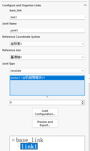 依次配置每个link对应的零部件或子装配体,选择旋转轴、参考坐标系、关节类型。