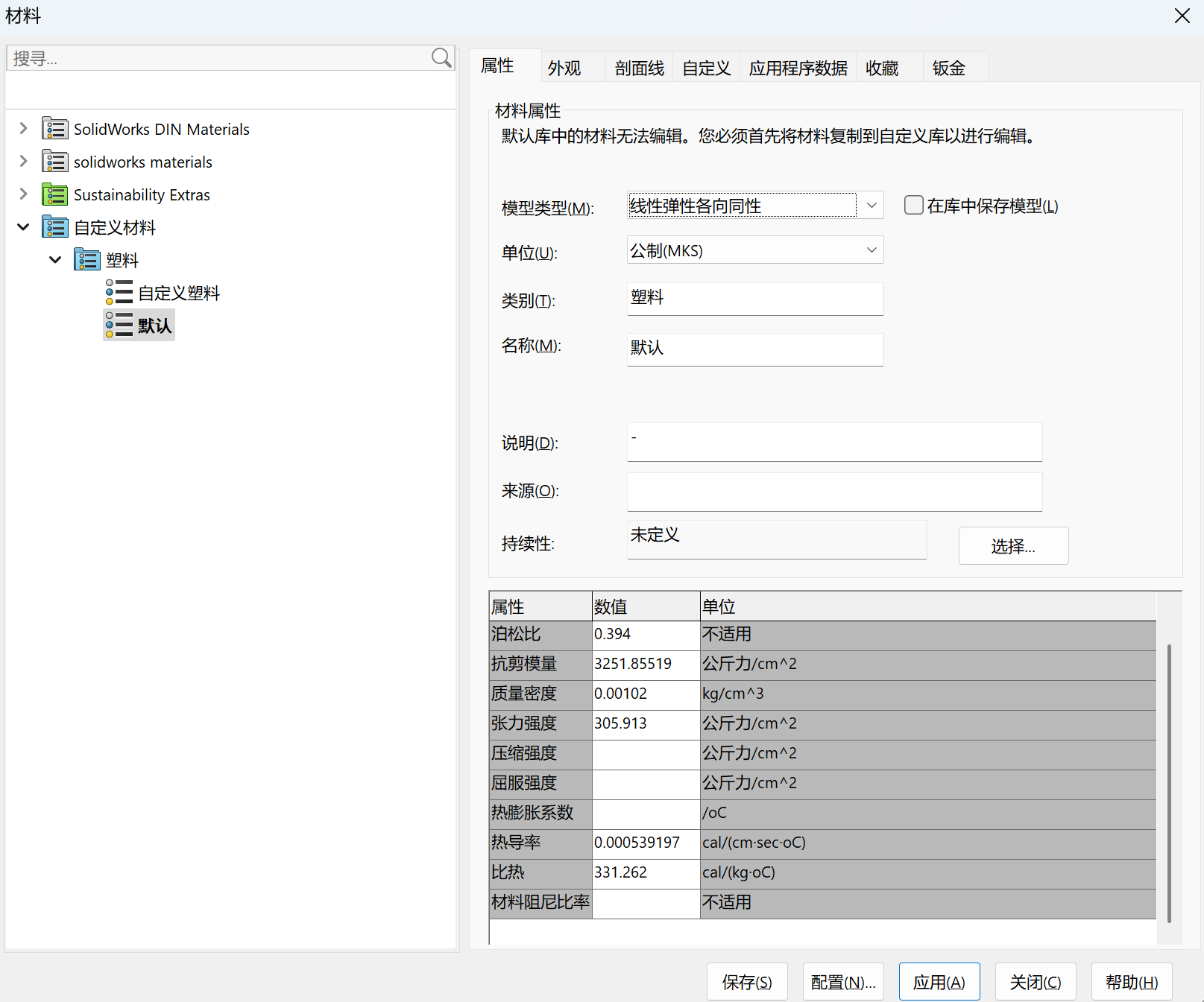 创建材料。选中任意零件,点击右键,在材料->编辑材料打开材料页面。选择材料文件夹,在自定义材料中的空白处,点击右键,在列表中选择新材料,输入密度参数(注意单位),自定义材料属性,为后续生成转动惯量等值做好准备。
