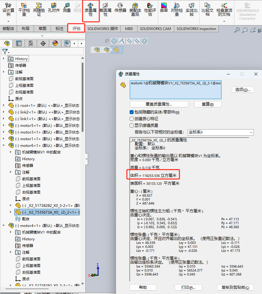 在评估->质量属性中可以查看零件体积。将6个电机的体积取平均数作为体积,再查看电机重量参数,计算出密度。