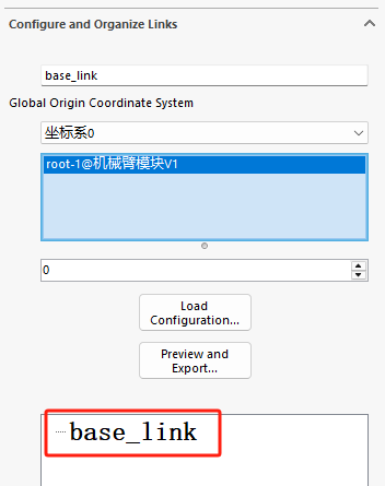 首先选择的是base_link,这是基座的名称,然后旋转基座的坐标系,以及SW中基座的子装配体。