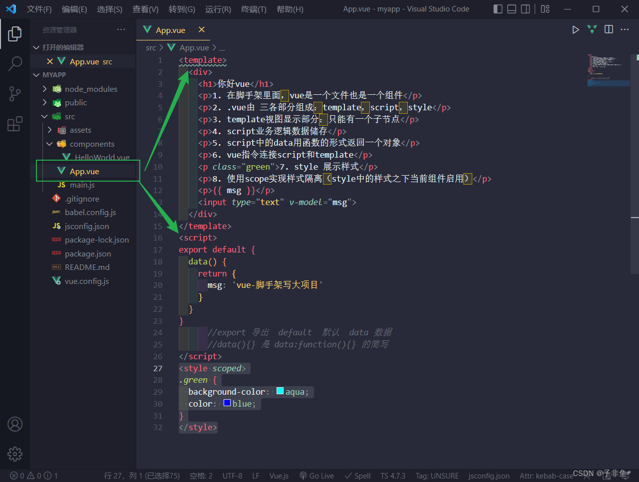 本文介绍了如何安装Vue脚手架,并详细解析了创建的Vue项目中各文件夹及其子文件的作用,包括node_modules、public、src等目录,以及App.vue根组件和main.js项目入口文件等内容。