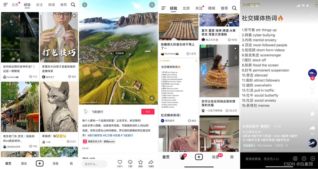 除此之外, 抖音近日还在顶部菜单栏中增加了“经验”栏目,另外也有用户显示为“探索”,这个栏目下的内容排列与小红书主页像素级相似,都采用双列瀑布流,图片+标题的模式,但两种不同的名字,却代表了两种不同的内容构成。