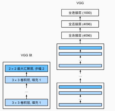 以VGG11为例,由5个vgg块组成,前两个块含有1个cnn,后三个块含有2个cnn