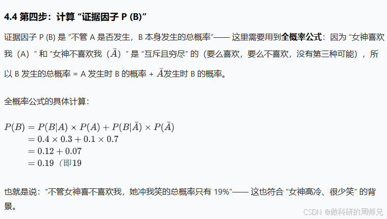 - P(B):证据因子(Evidence)——“事件 B 本身发生” 的总概率,和 A 无关。比如 “不管女神喜不喜欢我,她冲我笑的总概率”。